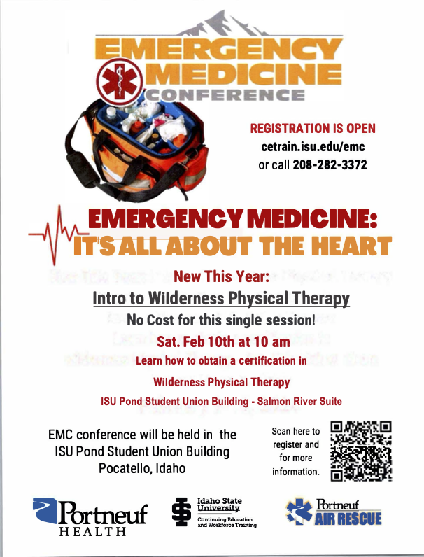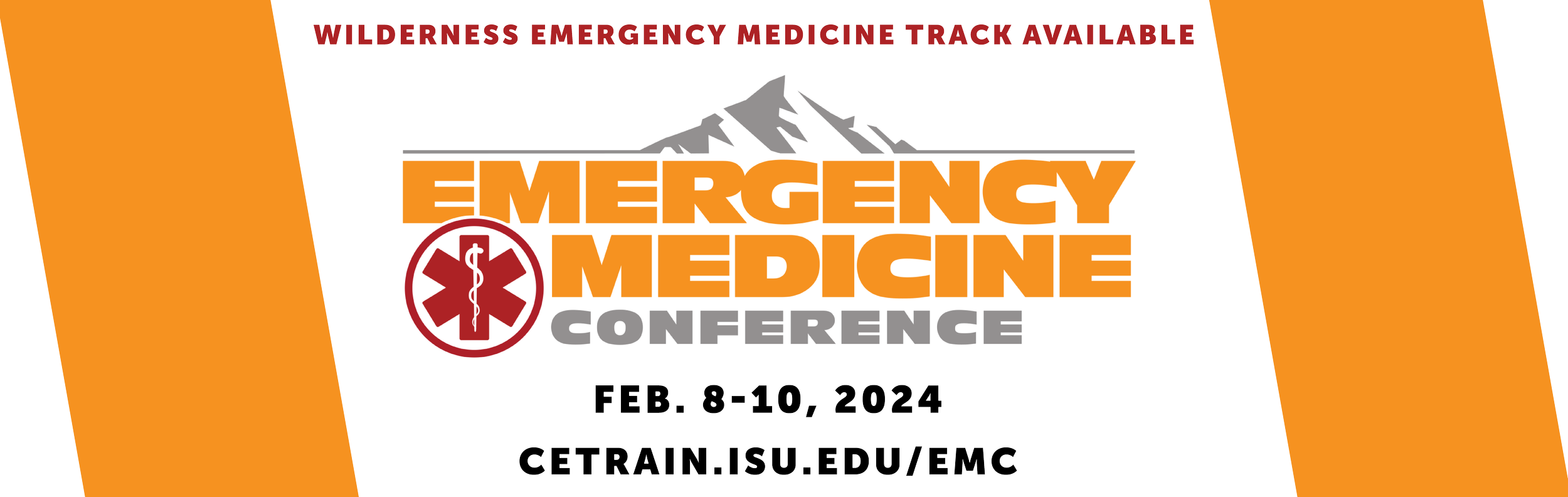ISU Emergency Medicine Conference Friday, February 9, 2024 7:30 AM Saturday, February 10, 2024 8:30 AM Google Calendar ICS Idaho State University - Pond Student UnionWilderness Track AvailableMain Conference - $50 (1 day only: $30 - call for details)